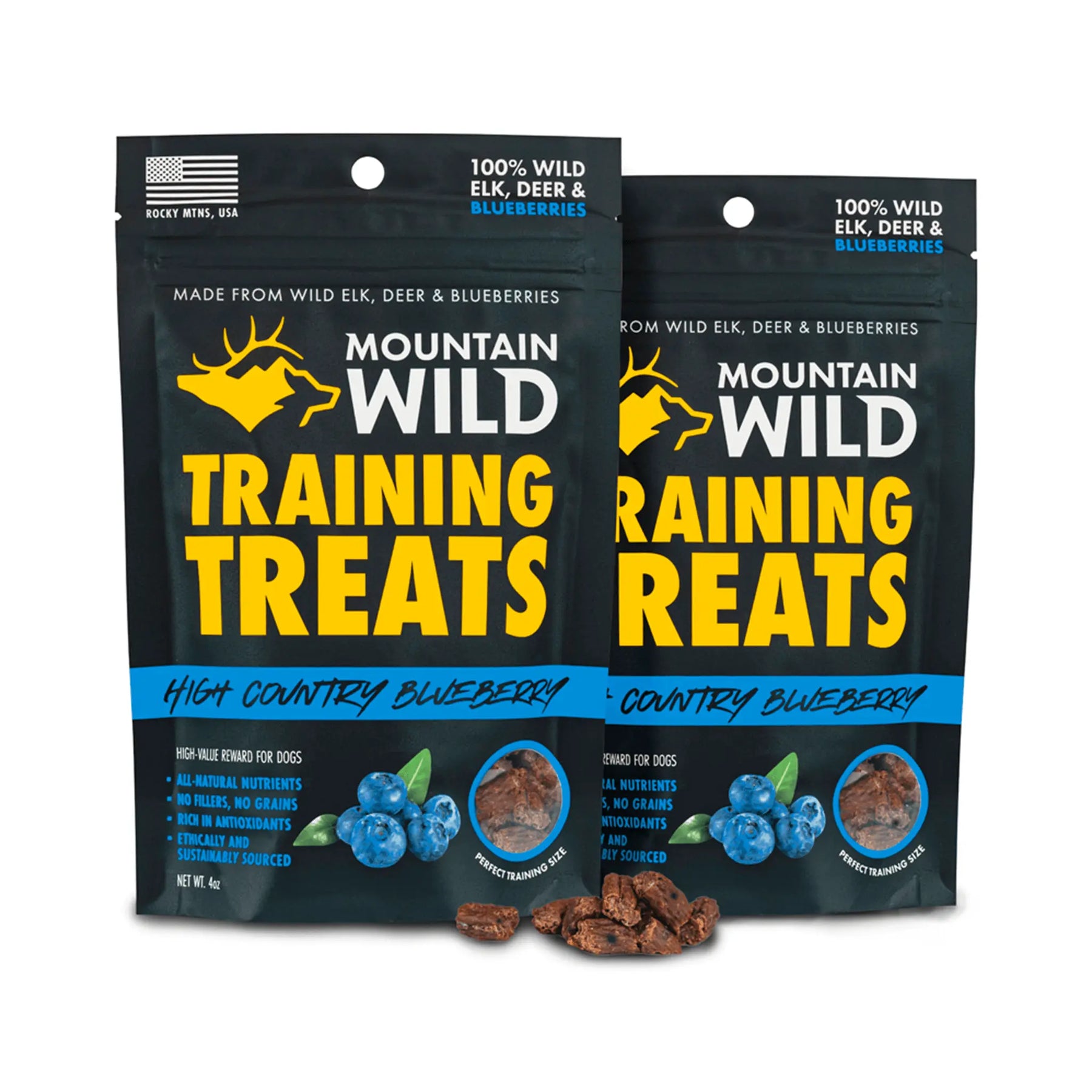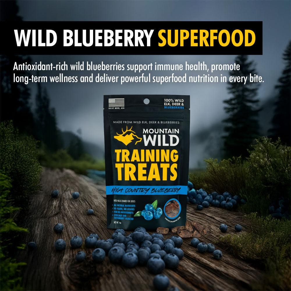 Take your dog training and nutrition to the next level with Mountain Wild’s Elk and Venison High Country Blueberry Training Treats. This one-of-a-kind recipe pairs wild elk and venison protein with antioxidant-rich wild blueberries, creating the ultimate superfood reward for dogs. Every nib is nutrient-dense and irresistibly flavorful, giving dogs the focus they need while delivering long-term health benefits from nature’s most powerful ingredients.